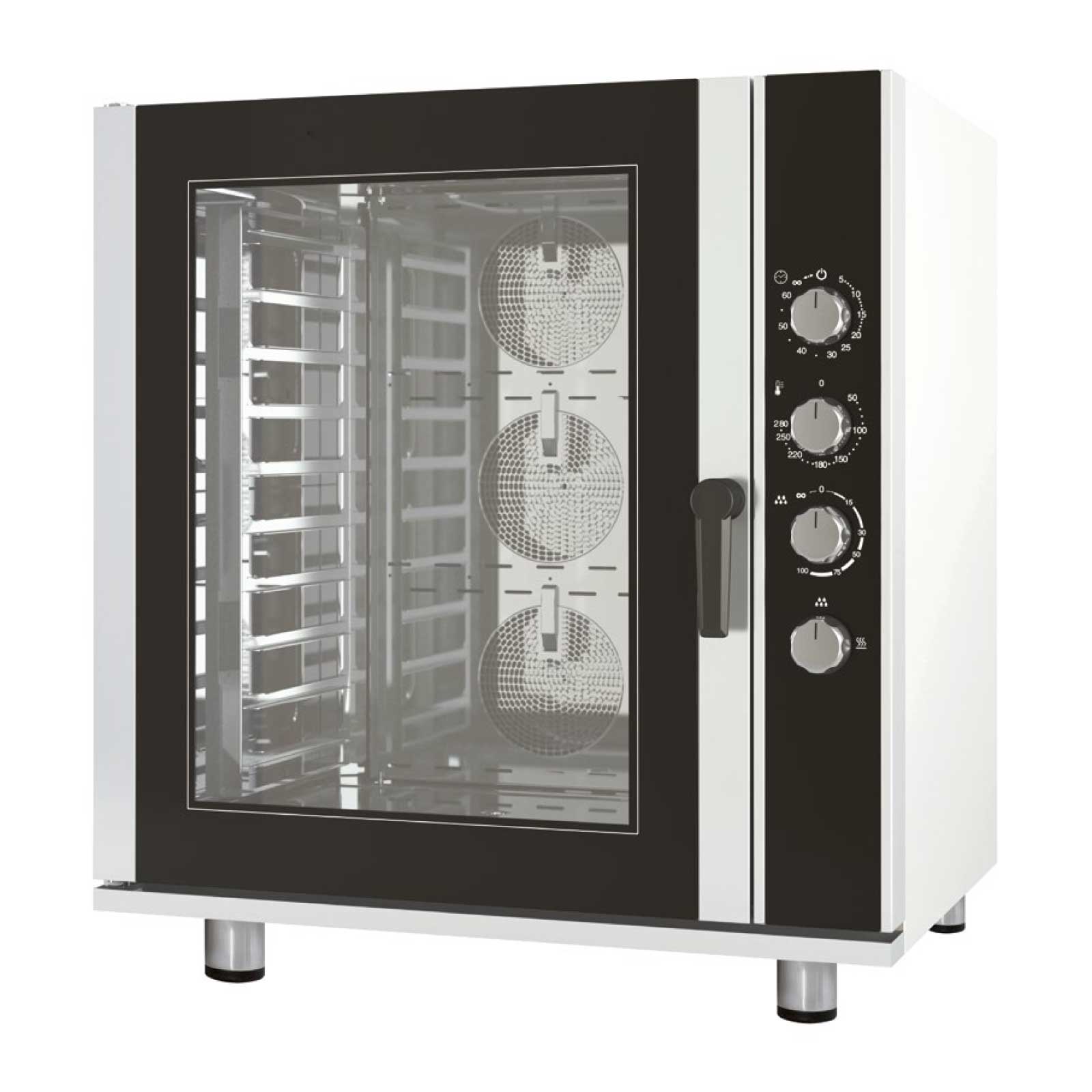 Horno profesional eléctrico de 10 bandejas 600×400 mm, con 4 mandos frontales, cámara en acero inoxidable, doble vidrio templado, luz interior y ventilación mediante 3 ventiladores.