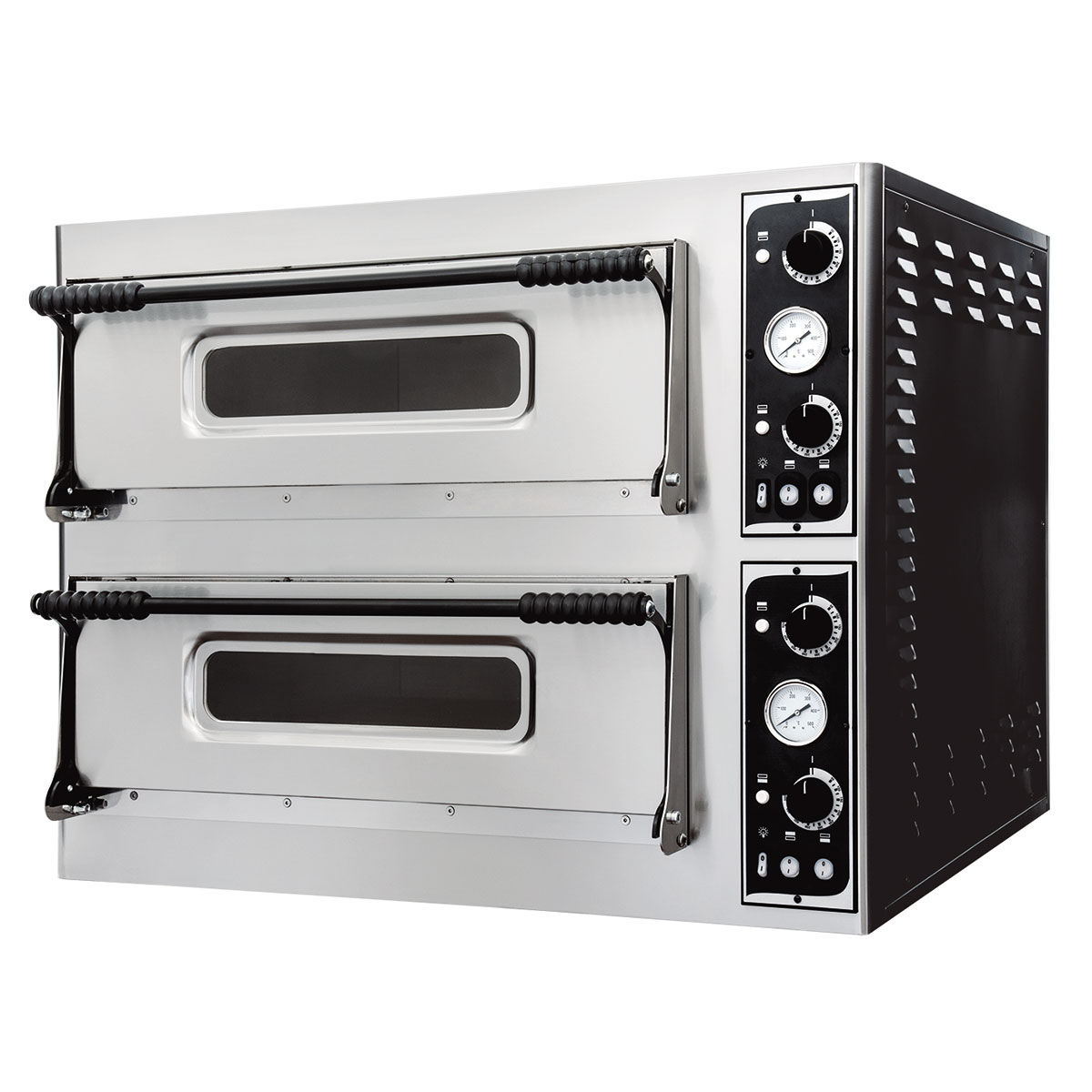 El CSB-BASIC 44 es un horno de pizza de dos cámaras independientes, diseñado para cocinar simultáneamente hasta 8 pizzas de 32 cm (4 por cámara). Es ideal para establecimientos que requieren alta productividad y control preciso de la temperatura en cada cámara. Incluye plano de cocción de piedra refractaria, iluminación interna y opciones de personalización con accesorios como campana y mesa de soporte.