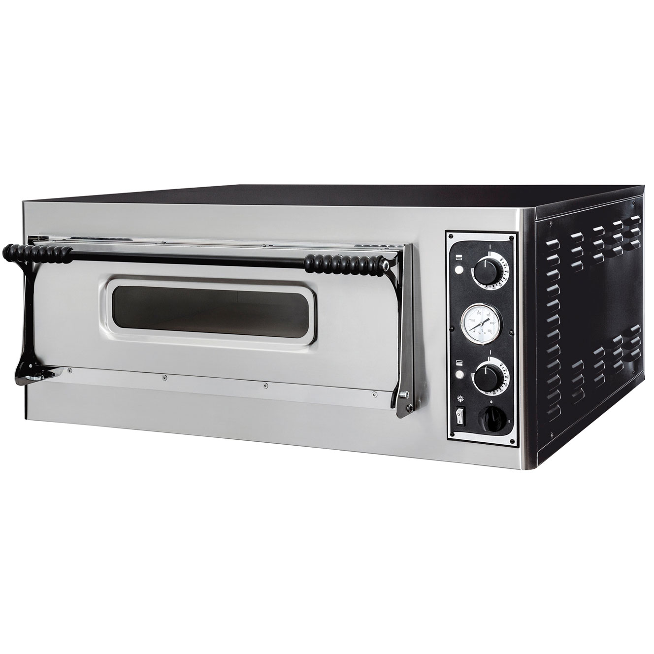 El CSB-BASIC 6 es un horno de pizza de una cámara, diseñado para cocinar hasta 4 pizzas de 32 cm simultáneamente. Es ideal para establecimientos con demanda media que buscan un equipo compacto, eficiente y con control de temperatura independiente. Incluye plano de cocción de piedra refractaria, iluminación interna y opción de accesorios como campana y mesa de soporte.