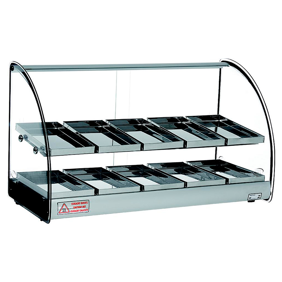 La CSB VC5+5 es la vitrina expositora de doble altura con una longitud considerable (77 cm), diseñada para ofrecer una gran superficie de exposición en dos niveles sin exceder el metro de largo. Este modelo es perfecto para negocios de alto tráfico que necesitan mantener una amplia variedad y cantidad de productos calientes (bollería, snacks o tapas). Está fabricada con perfil de aluminio anodizado y vidrios templados, e incorpora el sistema de calor con resistencia eléctrica y termostato para una conservación óptima.